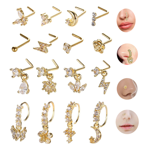 Women's Fashion Stainless Steel Nose Stud Rings L-Shaped Zircon Flower Piercing With Gold Plating Body Jewelry