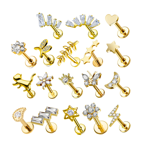 G23 Titanium Ear Stud Ring Butterfly Zircon Lip Ring 16G Labret Piercing Flat Back Earring Gold Plated Fashion Body Jewelry
