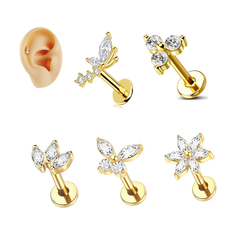 Triple CZ Flat Back Earrings Gold Plated Helix Conch Cartilage Tragus Flat Back Earring Stainless Steel Labret Lip Piercing