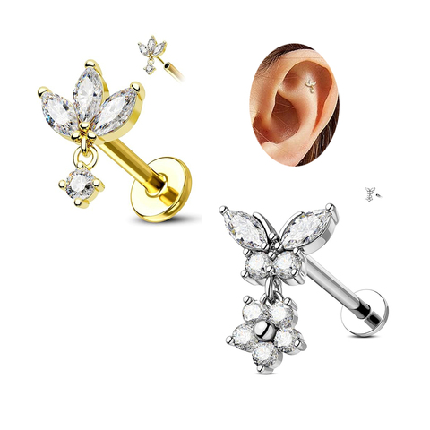 Chain Dangle Tragus Earrings Butterfly Cartilage Earrings 16G Surgical Steel Helix Piercing Jewelry Fashion Women Piercing